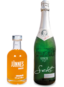 Eiswürfel, Jünnes Absacker und GOSCH Sekt in ein Sektglas geben und mit Orangenzeste dekorieren.